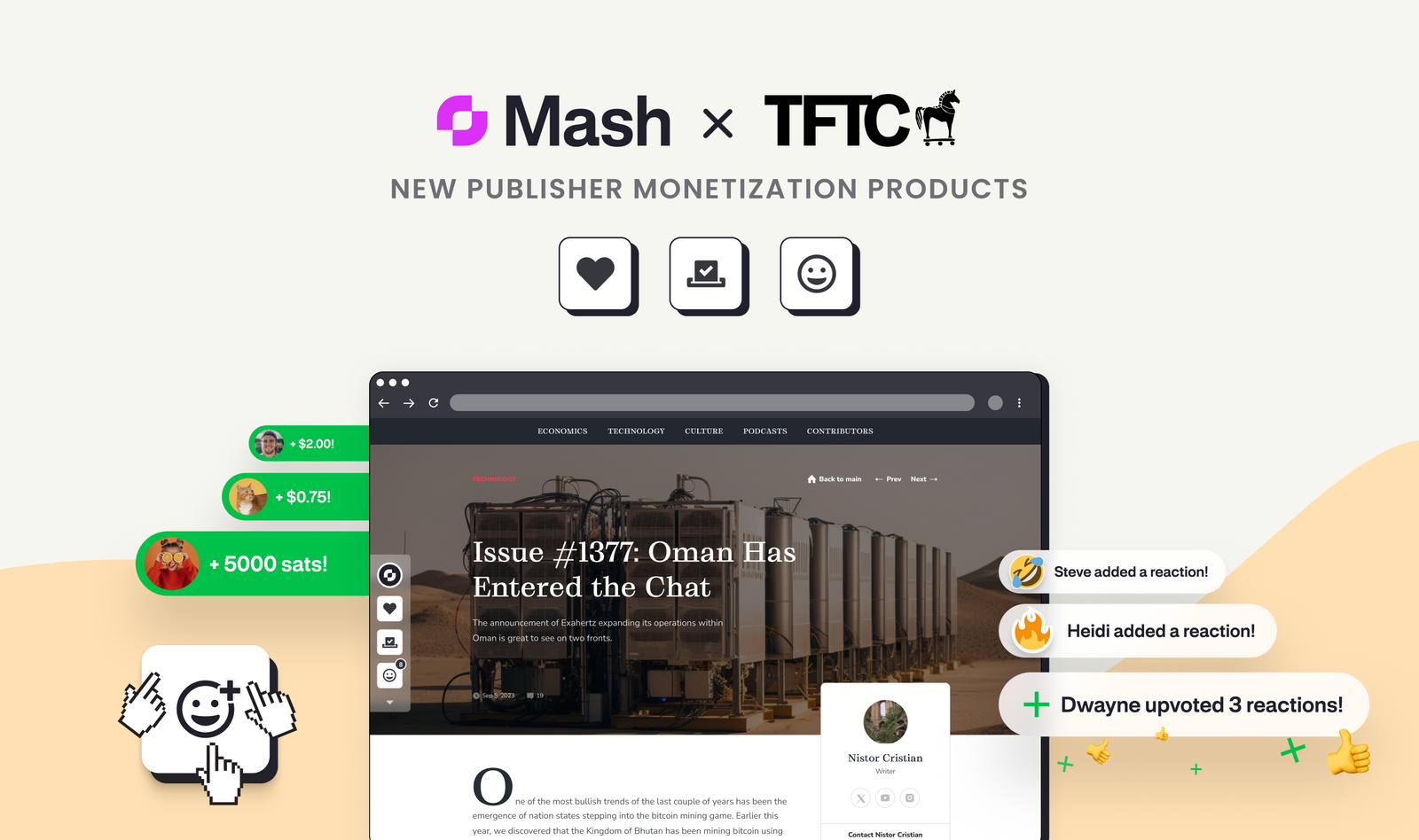 On top of this, Mash's suite of tools brings a new level of interactivity to the site that moves us far beyond a simple comment section. TFTC community members can now contribute to the content directly by adding reactions to each article that act as signal boosters to highlight important sections of articles. Community members can also send value directly to TFTC in the form of boosts, one-off donations, and participating in lightning enabled polls that we'll be able to embed in the content. Our partnership with Mash highlights the power of bitcoin and the lightning network. We would not be able to explore this model if bitcoin, lightning and Mash did not exist.