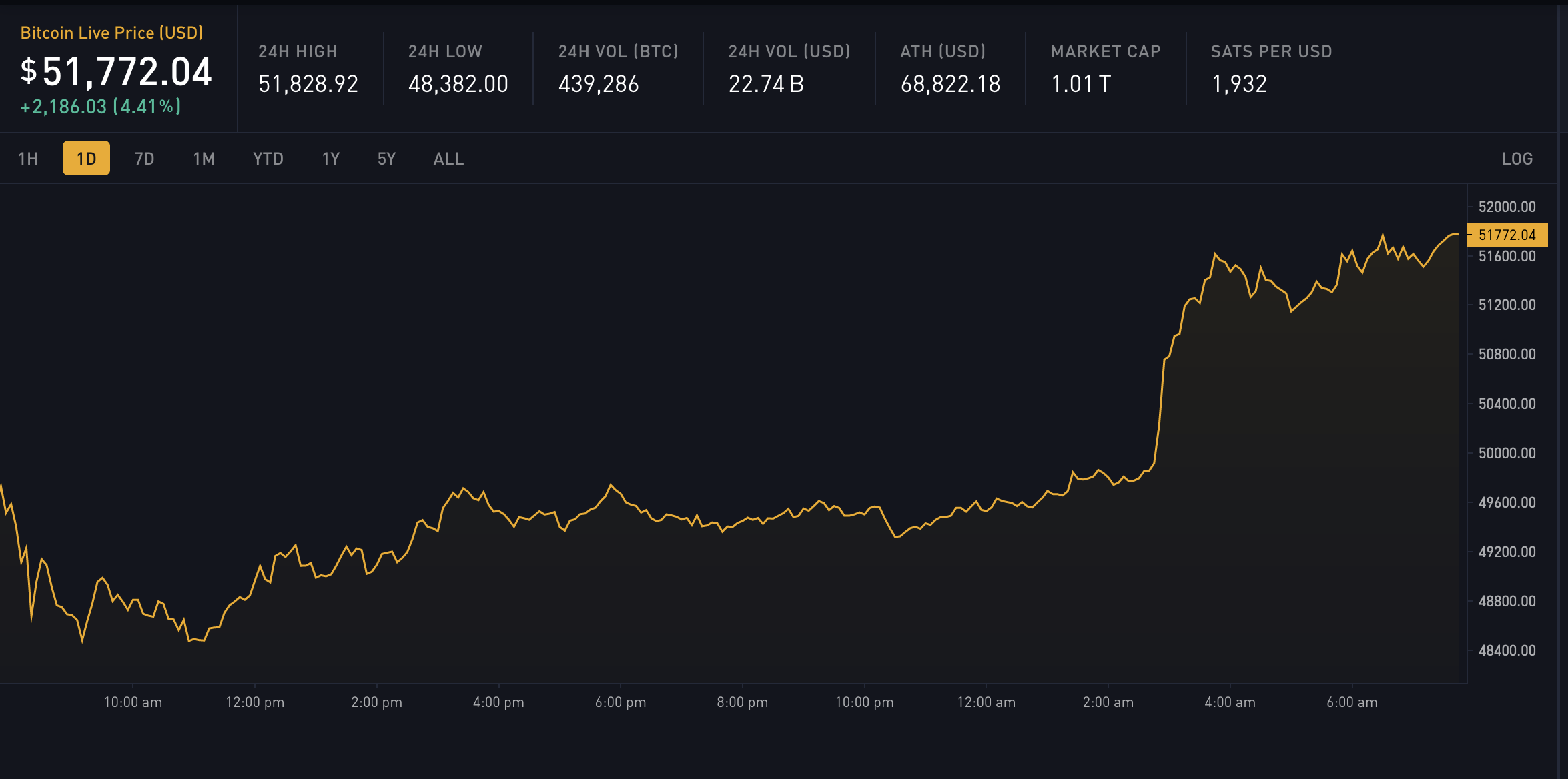 Bitcoin is back over $51,775 for the first time since early December 2021 and has surpassed a $1 Trillion market.