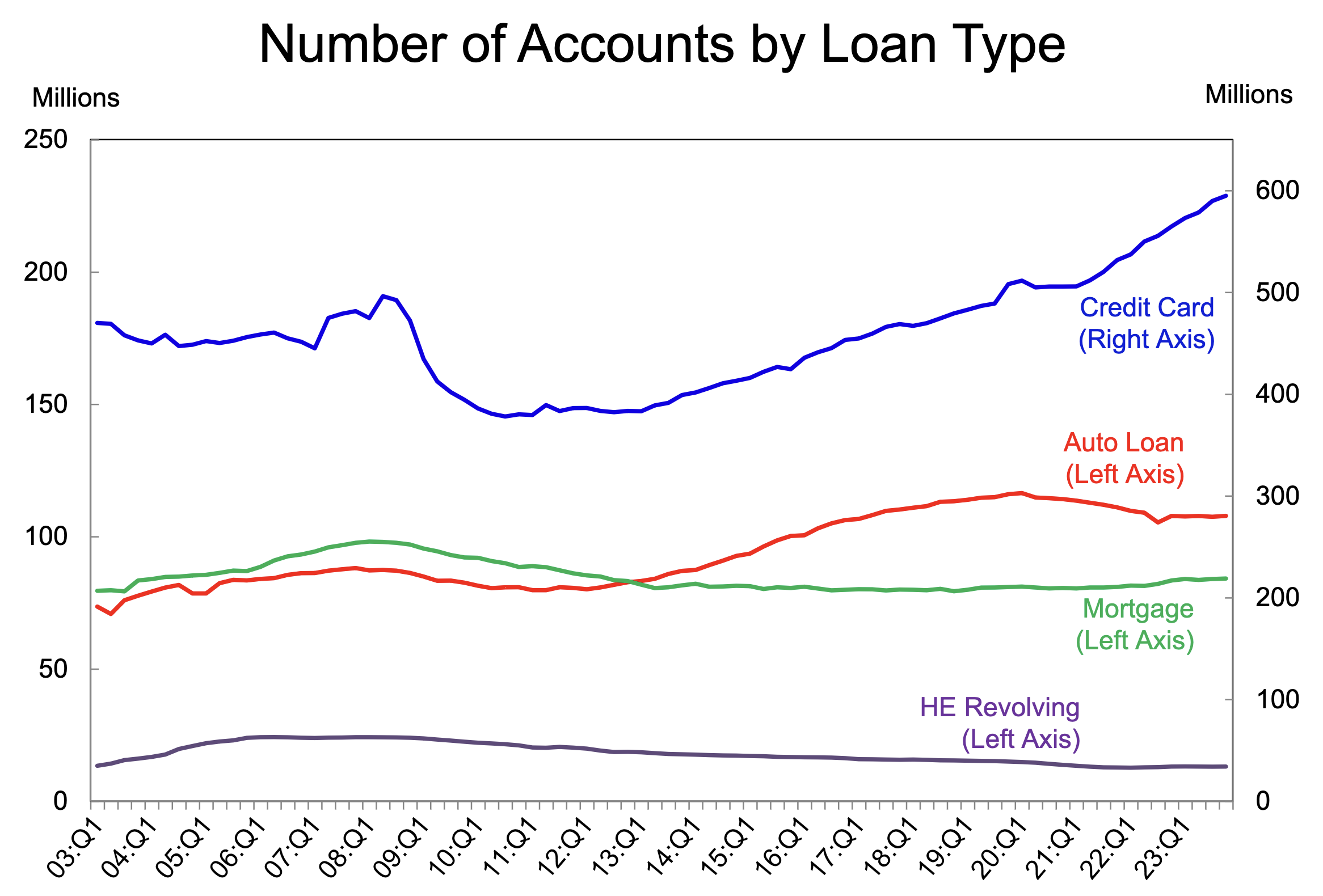 One of the most shocking pieces of data to come out of this report, something that made me rub my eyes to make sure I was reading the right axis correctly, is the number of credit cards held by Americans. Just under 600 MILLION. That is 2.29 credit cards per American over the age of 18. Utterly insane. As you can see from the chart below that number has increased by ~20% since 2020 and far surpasses the number of credit cards held by Americans right before the Great Financial Crisis.