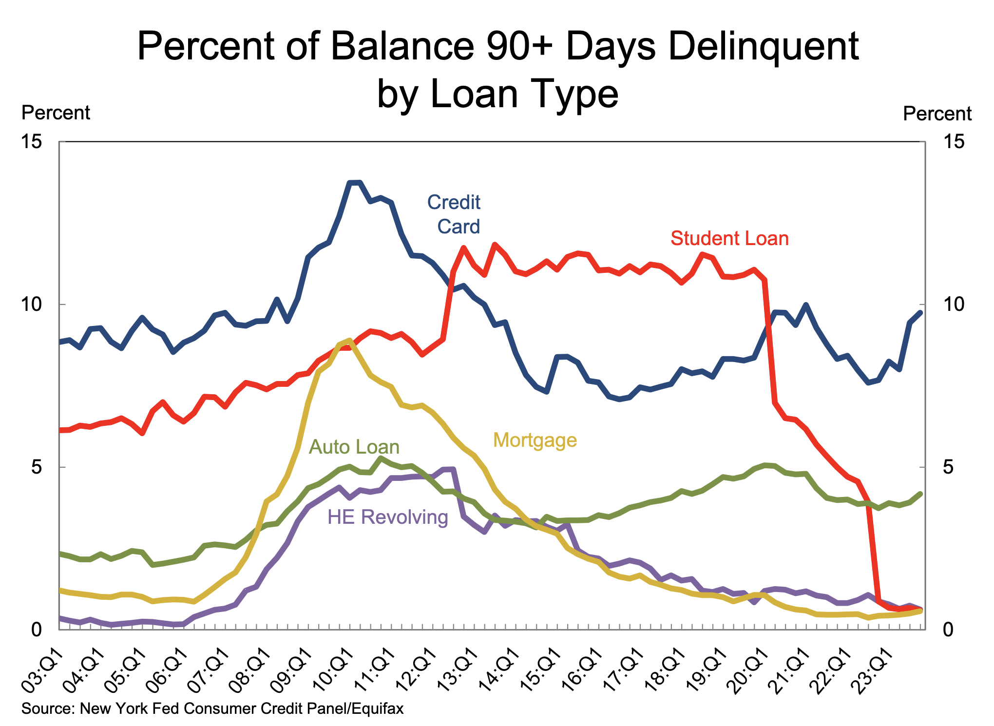 Using a squinting eye test it seems that the slope of the increase in 30+ day delinquencies for credit cards is steeper than it was in the lead up to 2008 and the 90+ day delinquency rate seems to be following a similar trajectory. It will take more time for that chart to paint a clearer picture. But I think it is easy to figure out what is happening here when you look at the delinquency rates across the different types of credit.