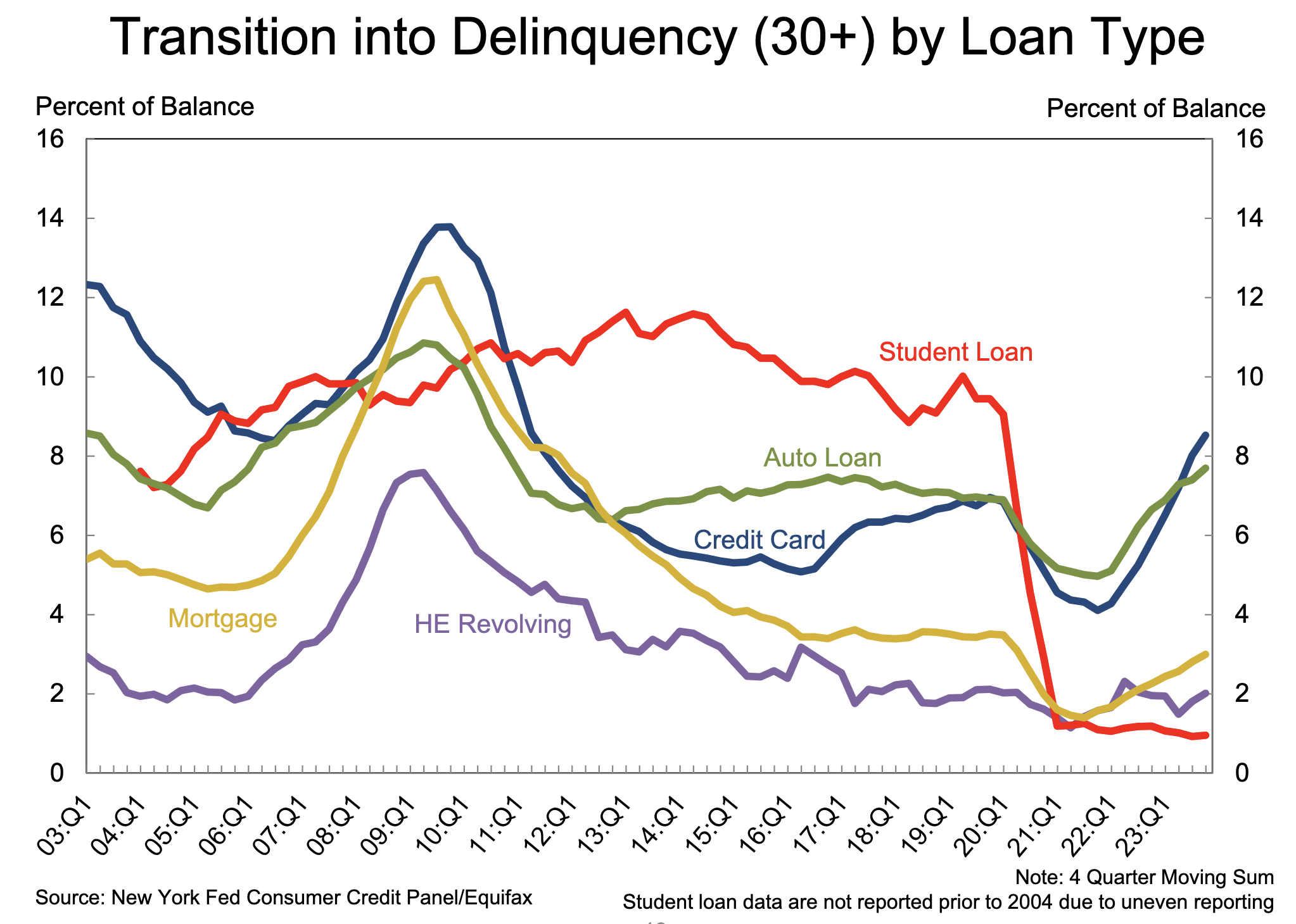 Earlier today the Federal Reserve Bank of New York released a report on the state of consumer credit. Dissecting data across student, auto, mortgage credit card, and other similar types of loans that US consumers have taken out and painting a bleak picture of the state of the average American. We'll take a look at some of the most glaring data below, but we'll first state that it seems pretty clear that the average consumer is completely tapped out, struggling to stay afloat, and quickly losing the ability to pay back the debt they've accrued.