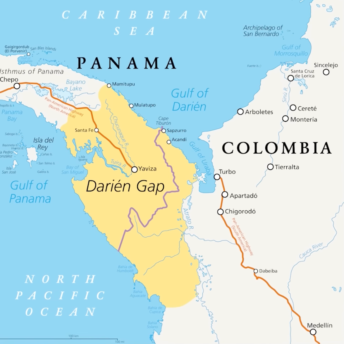 The Darien Gap is a dense jungle located between Panama and Colombia, serving as a break in the Pan-American Highway, which extends from Prudhoe Bay, Alaska, to the southern tip of South America. The gap is not a canyon but rather a 60-mile stretch of impenetrable jungle that has remained undeveloped due to both the difficulty of constructing a road through such a landscape and the dangers associated with the area.