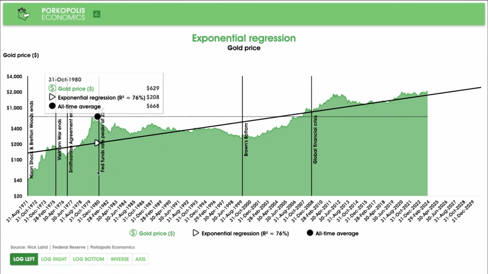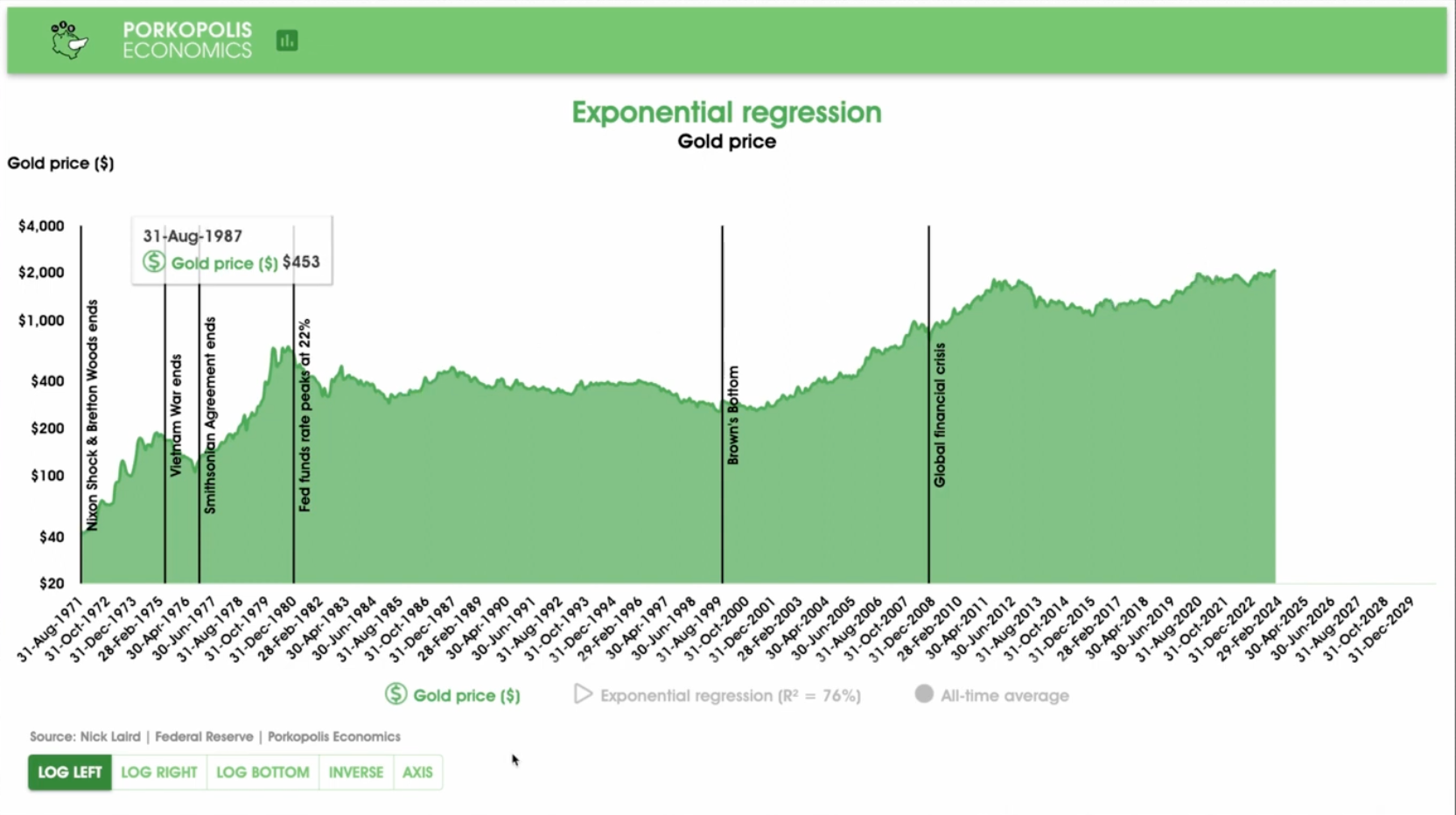 An exponential regression trendline, which is commonly applied to financial markets due to their exponential nature, shows a clear upward trajectory for gold prices on a logarithmic scale. This analysis takes into account daily gold price data and yields an R-squared value—or the goodness of fit—of 76%. While this indicates a reasonably strong correlation between the trendline and actual prices, it also acknowledges that there is room for significant variance.