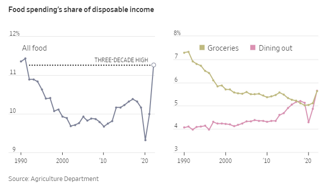 The proportion of disposable income spent on food is rising, which could indicate either an increase in food costs or a decrease in disposable income. Either scenario can have negative implications for the broader economy, potentially leading to decreased economic activity and potentially a recession.