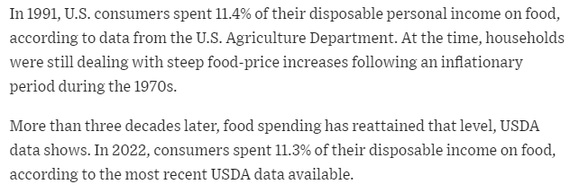Historical data shows that after periods of inflation, food prices tend not to return to previous levels. According to the U.S. Department of Agriculture, in 1991, U.S. consumers spent 11.4% of their disposable personal income on food, a figure influenced by the inflationary period of the 1970s. This trend suggests a long-term shift in spending patterns, potentially exacerbated by preferences for more expensive, healthier food options which emerged during the 1970s and 1980s.