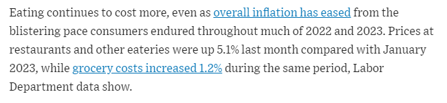 Despite claims that inflation is easing, food costs continue to rise. The Wall Street Journal reports a 5.1% increase in restaurant prices and a 1.2% increase in grocery costs year over year. These figures, however, seem inconsistent with other data that show higher increases across various food categories.