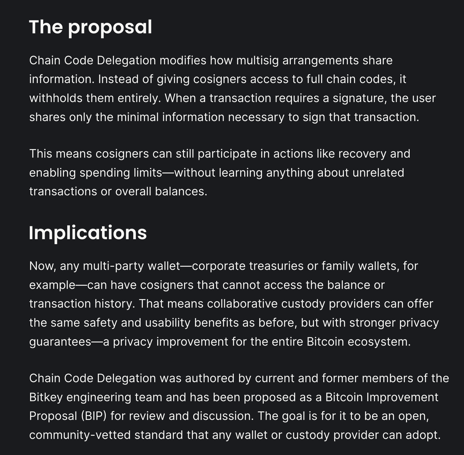 Yesterday Bitkey submitted a Bitcoin Improvement Proposal (BIP) for "Chain Code Delegation", which would significantly improve the privacy of bitcoin users who utilize collaborative multisig set ups. For those who are unaware of collaborative multisig setups, the concept is that, as a user, you can increase the robustness and resiliency of your multisig wallet by adding a collaborative custody partner to the multisig quorum. This is the model that companies like Bitkey, Unchained offer their clients.