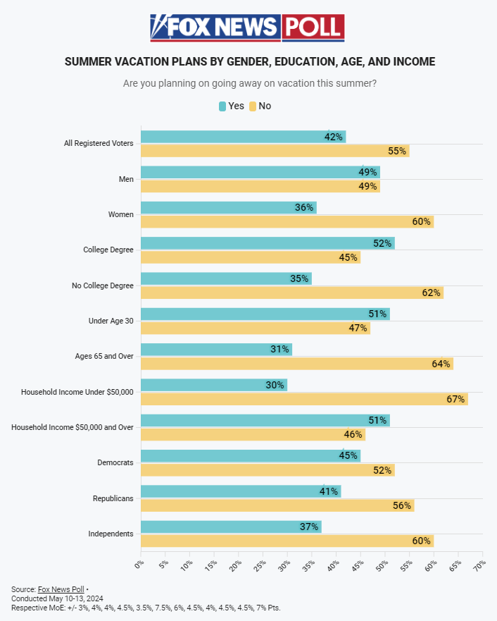 The poll also reveals demographic disparities in summer travel plans. College-educated voters, younger voters under 30, and households with an annual income above $50,000 are more likely to travel. In contrast, women, voters without a college degree, seniors over 65, and households earning less than $50,000 are predominantly opting not to vacation.