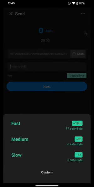 Select a fee based on how quickly you want the transaction to be processed—higher fees can lead to faster confirmations.