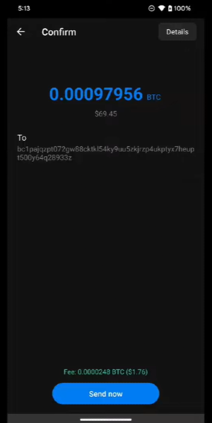 Confirm and send. Your transaction will now be broadcast to the Bitcoin network.