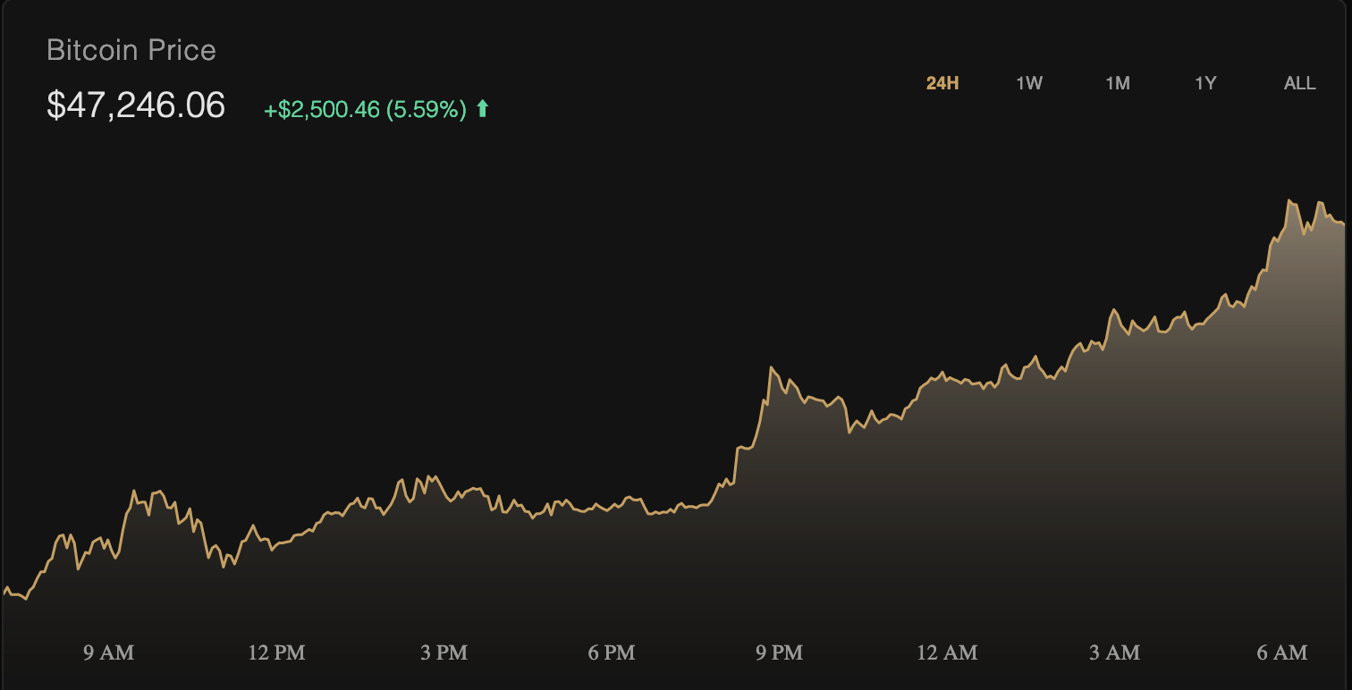 The price of bitcoin is up more than 5% over the last twenty four hours. It is highly unlikely that the price movement over the last twelve hours is being driven by the events of last night. There are multiple disparate factors that drive the price of a very liquid scarce asset that trades 24/7/365. However, it is impossible to ignore the poetic timing of this particular rise in price. It's almost as if God is sending the world a message, "Now that it is clear to you that the politicians have lost control, maybe you should pay attention to bitcoin."