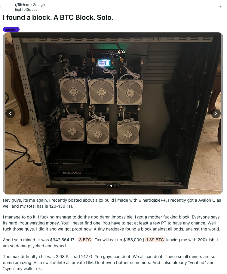 Here's a feel good story to start your week. On Thursday of last week, at block height 920,440 a solo miner with 6 nerdqaxe++'s producing 120-130 TH/s (not a lot of hash rate for the uninitiated) found the hash below the difficulty target and successfully added a block of transactions to the bitcoin ledger and was awarded 3.141 bitcoin (3.125btc subsidy + .016btc in transaction fees) for his work. You absolutely love to see it.