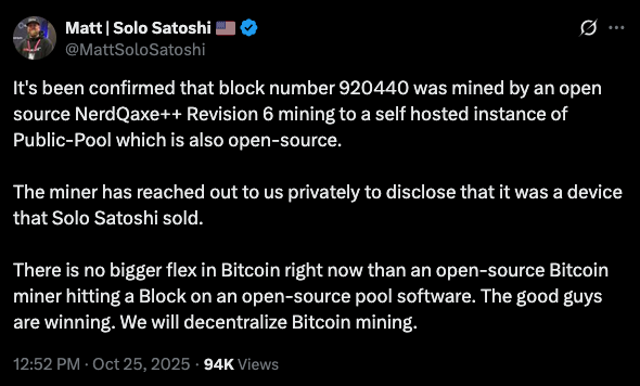 The story gets even better. As Matt from SoloSatoshi has relayed, not only was the mining hardware that was used open source, but the successful solo hasher was using a self-hosted instance of Public-Pool, which is an open-source mining pool software. Think about that for a minute.