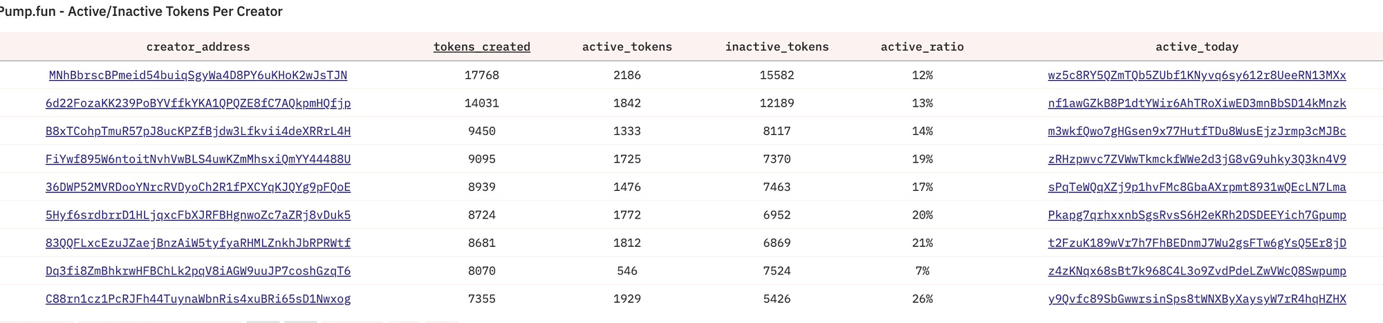 What you are looking at is a table of individual Solana addresses, the number of memecoin tokens they've created, how many of those memecoins are currently active, how many of them are currently inactive, and the ratio of active:inactive coins created by each individual. This chart perfectly describes the complete degeneracy and, more importantly, worthlessness of altcoins. Particularly, memecoins. Even more importantly, the dynamic currently unfolding in the memecoin space highlights just how differentiated bitcoin is and why "alt season" will never be the same.