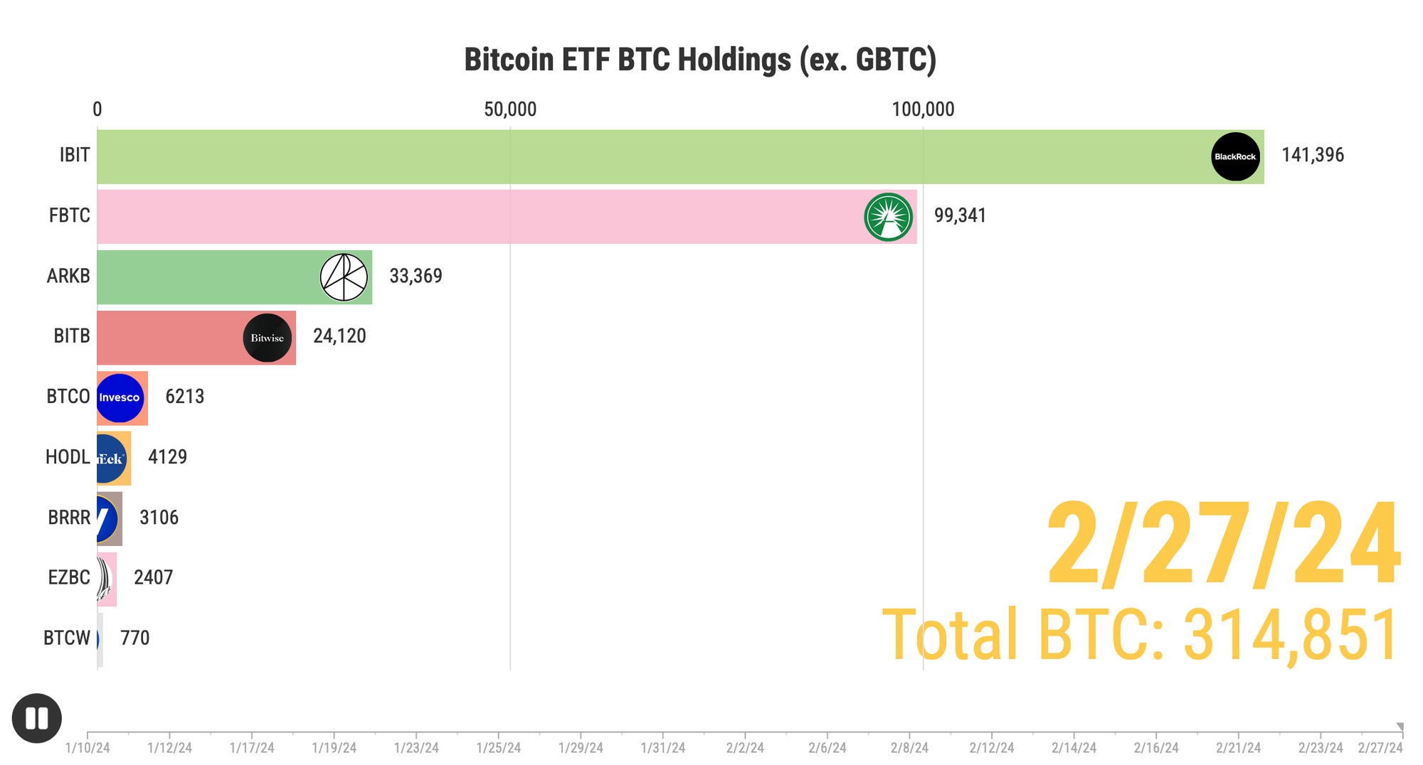The flows coming into bitcoin from the ETFs at the current moment are quite impressive. Since the ETFs launched, all of the issuers (ex. GBTC) have scooped up 314,851 bitcoin. To put this into context, today along they added 10,000+ bitcoin to their products, which is more than 10x the daily network issuance of 900 bitcoin. Come block 840,000 the daily issuance will be cut to 450. If this pace of buying keeps up it isn't hard to see that we could be entering some uncharted price discovery action territory. (If you're going to hold bitcoin you should actually hold and not ETF shares. Unchained is a great way to actually hold bitcoin using a collaborative custody model.)