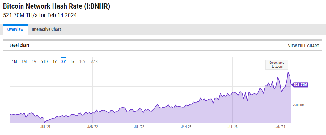 A critical measure of Bitcoin's underlying technology, the network hash rate, has seen a substantial increase. Currently, it is at 521 million terahashes, which is a significant rise from the 130 million terahashes recorded the last time Bitcoin traded at similar levels.
