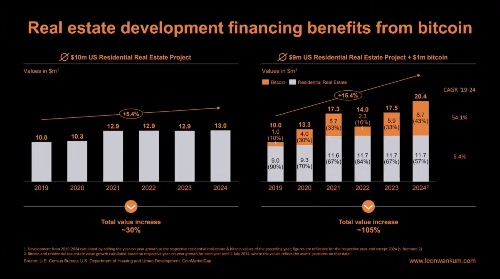 There are many more nuanced benefits to this strategy; holding bitcoin allows landlords and management companies to weather ongoing maintenance costs throughout the years, those who take out mortgages dual collateralized with a house and bitcoin not only protect the equity value of their property but could see their equity values increase significantly more than others using vanilla mortgages, and builders who accumulate bitcoin in their treasuries will be able to use better raw materials when building, which leads to more valuable properties that cash flow for longer.