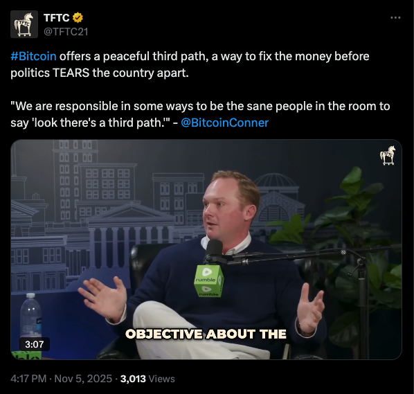 Bitcoin is truly the middle path that can lead us to a more peaceful and cooperative future in the United States. The working class can save the fruits of their labor in a money that can't be debased. Bailouts won't be as easy of an option and companies will have to manage risk appropriately. On top of that, business owners will have to compete for labor by paying fair wages. There won't be a need to flood the country with immigrants. The university system will be slowly defunded and students won't have the luxury of getting a gender studies degree that has not practical use in the real world.