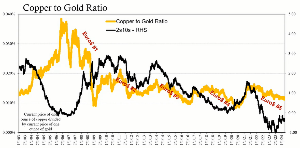 Historically, the copper-to-gold ratio has exhibited a close relationship with the yield curve. Periods of economic uncertainty and liquidity pressures have seen a decline in the ratio, alongside flattening or inversion of the yield curve. This trend has been consistent across different economic cycles, including the lead-up to the 2008 financial crisis, the European debt crisis, and the reflation period post-crisis. Currently, the near multi-year low in the copper-to-gold ratio suggests that the economic outlook is not as robust as some narratives suggest.