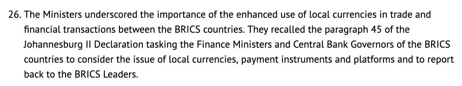 As it pertains to the beat of this newsletter, the discussions about "enhanced use of local currencies in trade and financial transactions between the BRICS countries" is the most important part of the discussion. These comments represent a continuation of a theme that we've been following for years; de-dollarization by countries who are fed up with the petrodollar system and the fact that it gives the US somewhat of a free ride considering the fact that it drives demand for dollars and US treasuries.