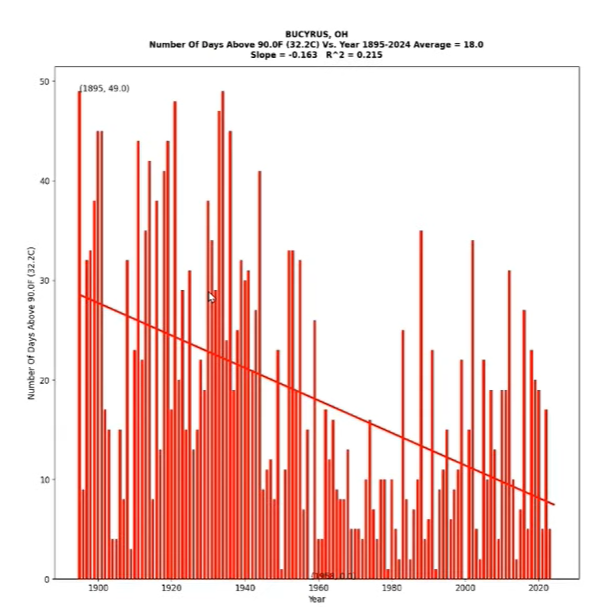 The trend observed in Bucyrus is reportedly not isolated. Data averaged across the United States suggests a similar downward trend in the number of 90-degree days. This nationwide trend contrasts with the narrative suggesting an overall warming that would increase the frequency of such hot days.