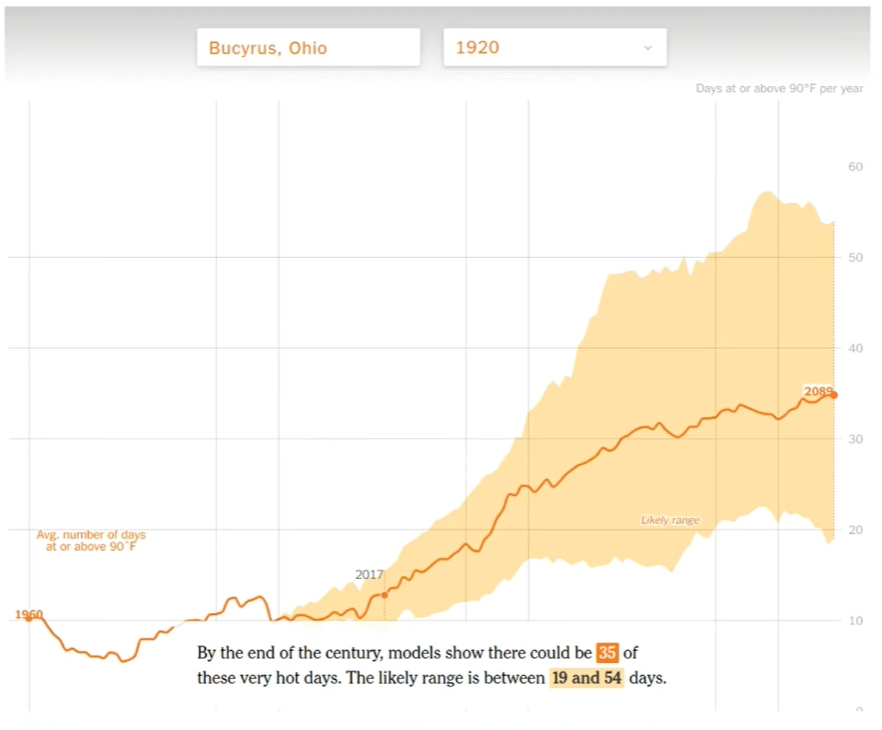 A recent analysis of climate trends by the New York Times suggested that, as a consequence of human-induced climate change, regions like Bucyrus should expect an increase in the number of days reaching 90 degrees or higher. The New York Times' data interface allowed users to explore temperature changes starting from 1920, though their data set reportedly begins in 1960. According to their analysis, the Bucyrus area could anticipate about ten such hot days per year based on records starting from that year.