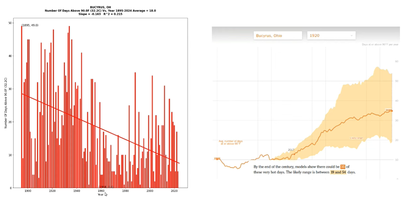 When comparing the modeled predictions provided by the New York Times with the actual historical data from Bucyrus, discrepancies emerge. The historical data shows a decline in the frequency of hot days, whereas the models predict an increase. The exclusion of data prior to 1960 in the New York Times' analysis raises questions about the completeness of their representation and the validity of their projections.