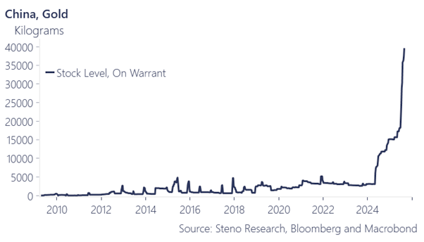 Why would China want to rapidly increase the amount of gold held on warrant? There are a number of reasons why they would. There could be a lack of liquidity in the system that is relieved by registering gold on warrant because it can then be used as collateral, leased, or more easily traded.