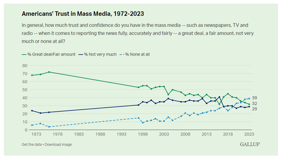 The decline in trust correlates with a period starting around 2018, when media outlets increasingly abandoned their objective stance, beginning with their coverage of Donald Trump and extending to various cultural and political issues. This shift has led to a perception of the media as protectors of a particular ideological elite, decreasing their credibility on topics ranging from vaccinations and social unrest to economic policies.