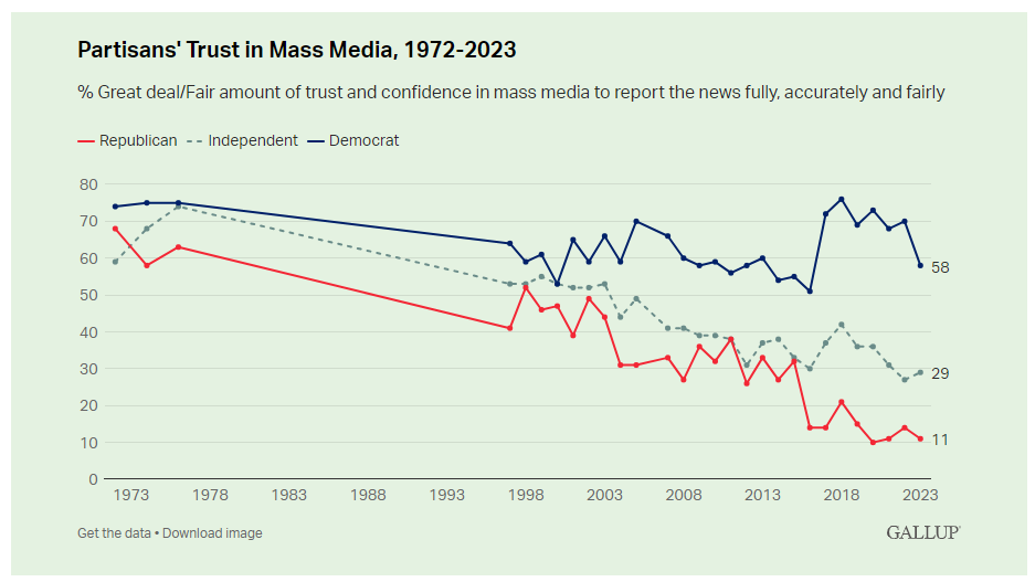 Behind the staggering job losses is a significant decline in public trust in media. Only about one in three Americans express any trust in media, with a record 40% reporting zero trust whatsoever. This skepticism spans the political spectrum, with just 29% of independent voters and a mere 11% of Republicans expressing trust. Even among Democrats, there has been an 18-point drop in trust since the COVID-19 pandemic, particularly among younger demographics.