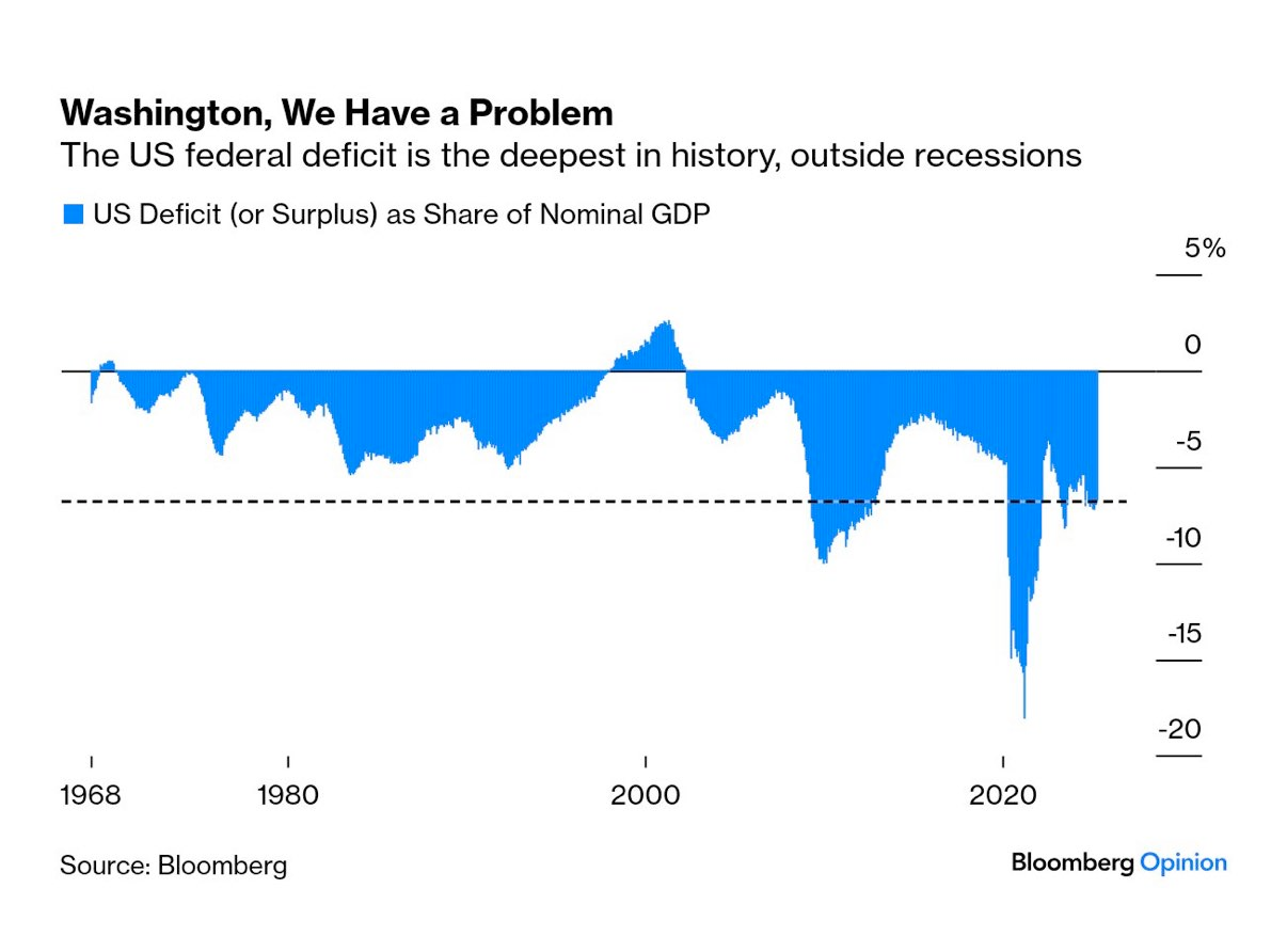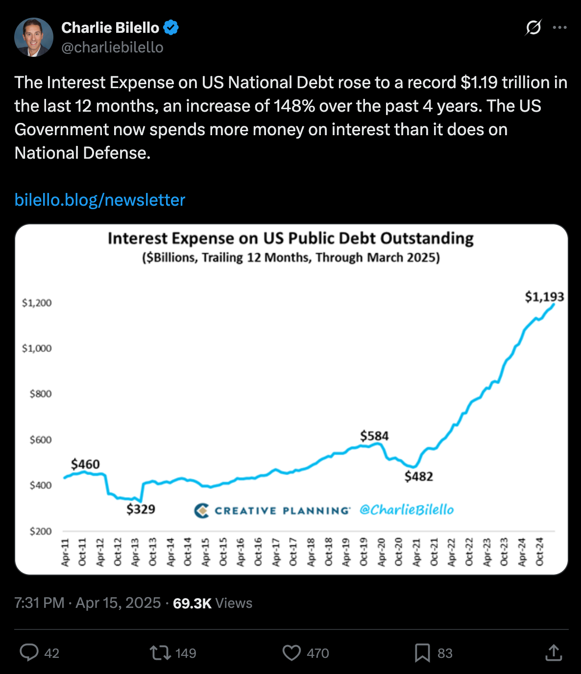 On that note, data from the first quarter of 2025 has been released by the government and despite all the posturing by the Trump administration around DOGE and how tariffs are going to be beneficial for the U.S. economy, deficits are continuing to explode while the interest expense on the debt has definitively surpassed our annual defense budget.