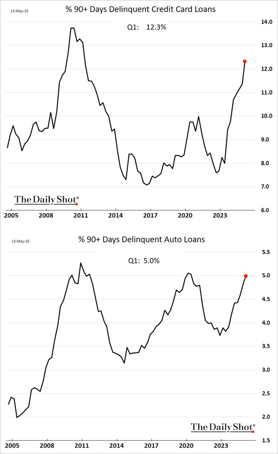 To make matters worse, as things are deteriorating on the fiscal side of things, the U.S. consumer is getting crushed by credit. The 90-plus day delinquency rates for credit card and auto loans are screaming higher right now.