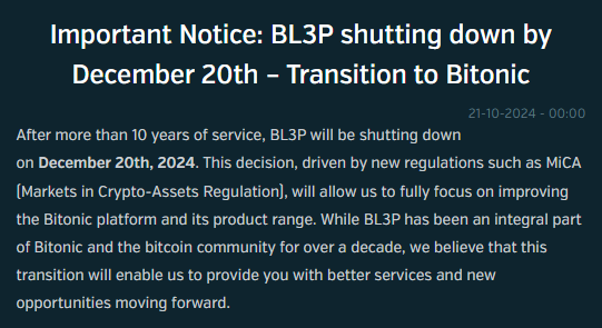 Dutch bitcoin-only exchange BL3P will close operations on December 20, 2024, due to new regulations, with users encouraged to transition to its parent platform, Bitonic.