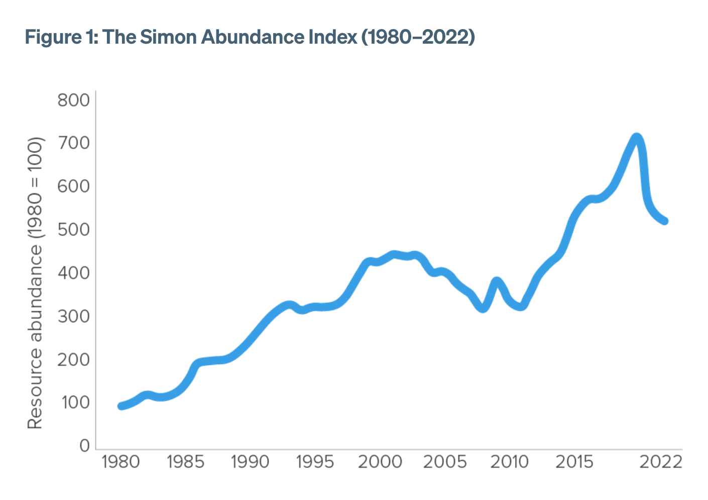 Julian Simon famously bet with environmentalist Paul Ehrlich that the prices of selected commodities would decrease over ten years. Simon's victory demonstrated that resources become more abundant as humans find innovative ways to discover and utilize them.