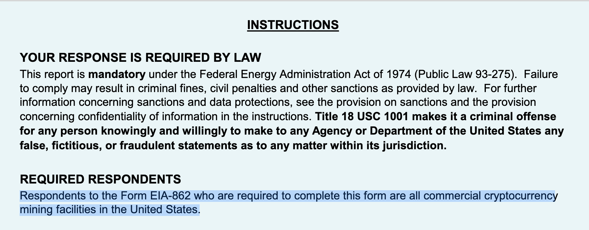 That's when I decided to take a look at the actual survey. Upon review, it proves to be one of the more Orwellian things I've seen come out of this Administration. And that's saying a lot. If you dig into the information that the EIA is requesting, it looks as if the EIA is setting out to create a hyper-detailed registry of mining operations in the United States. Getting as granular as to request specific information about mining fleets and hashrate data. And as with any Dystopian edict put forth by a government gone mad with perceived power, the survey starts out with an overt threat.