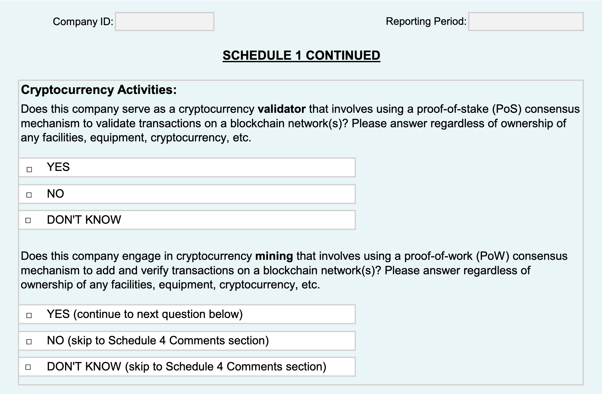 The companies will also be required to identify whether they are running operations that involve Proof of Stake or Proof of Work consensus mechanisms.