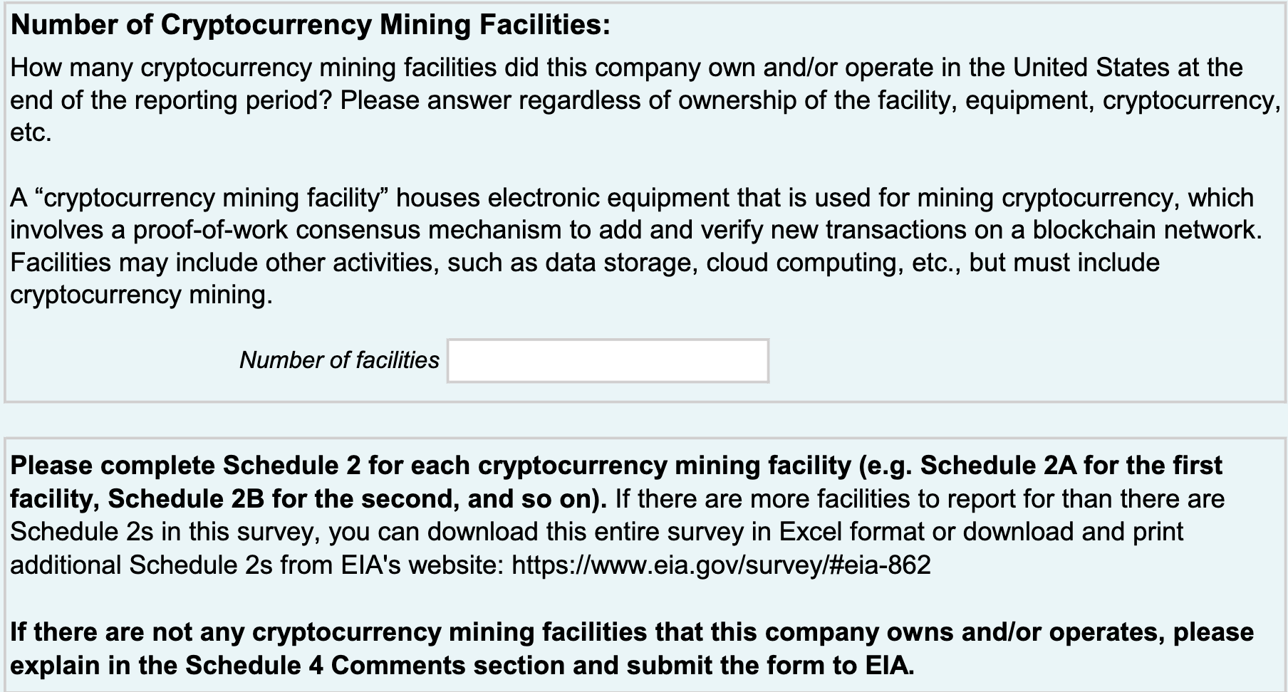 If you are an operator in the bitcoin mining industry in the US it is imperative that you ignore this survey and tell the EIA, the Department of Energy, and the current administration to fuck off. Bitcoin miners are law abiding electricity purchasers who are engaging in mutually beneficial economic contracts with power providers who are trying to optimize their revenue streams so that they can profit more and invest in providing more reliable services to their end customers. The continued attempts to discriminate against the bitcoin mining industry should be seen as nothing less than harassment and unconstitutional.