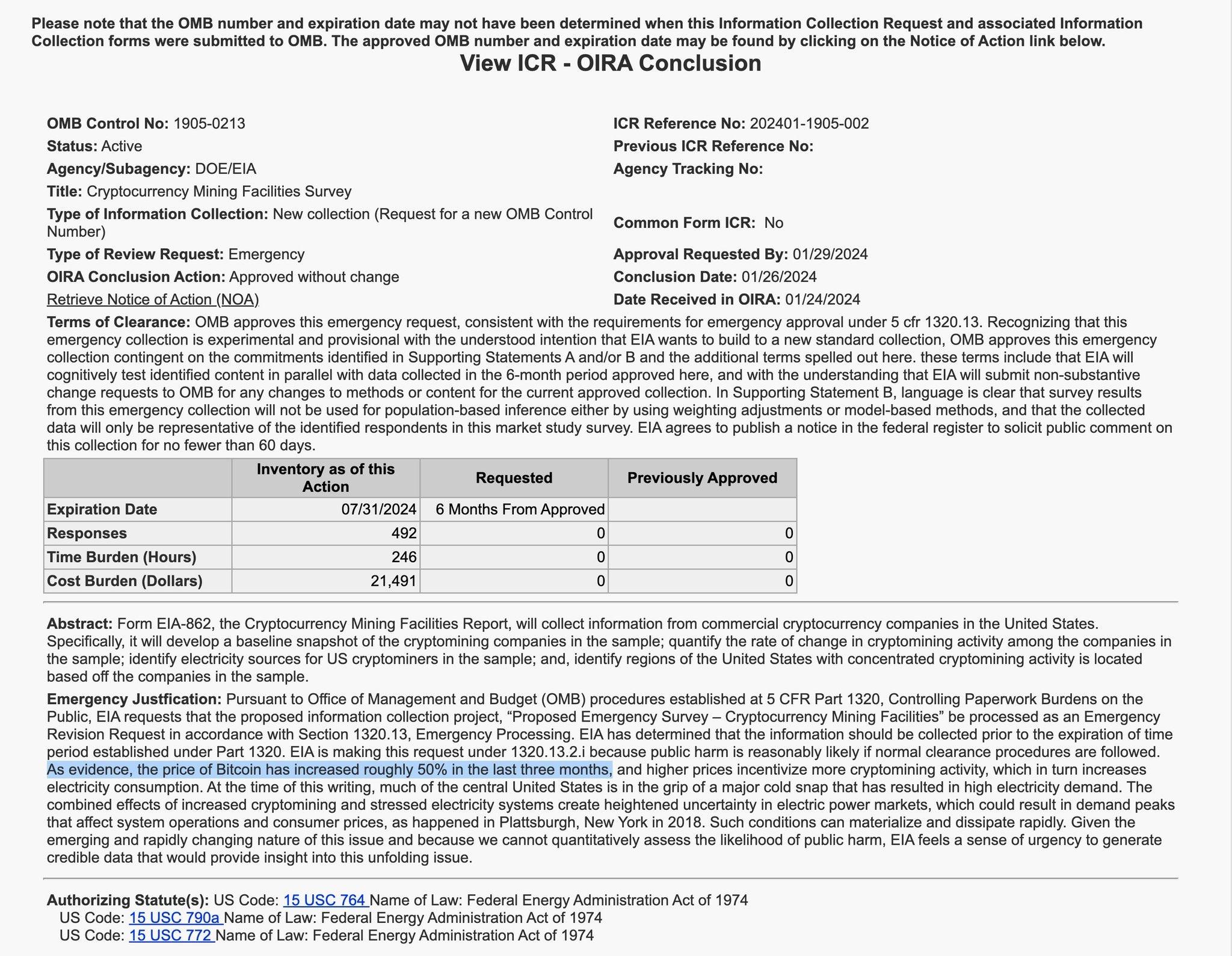Earlier today, the Biden Administration announced an emergency data collection initiative targeted at bitcoin mining operations in the US via the US Energy Information Administration, an "independent" sub-agency of the Department of Energy. It seems that the Biden Administration is identifying the electricity usage of the bitcoin mining industry as an emergency that is threatening grid stability throughout the US, as is evidenced by the name of the survey; "Proposed Emergency Survey - Cryptocurrency Mining Facilities". Here is the press release and the official filing from the EIA.
