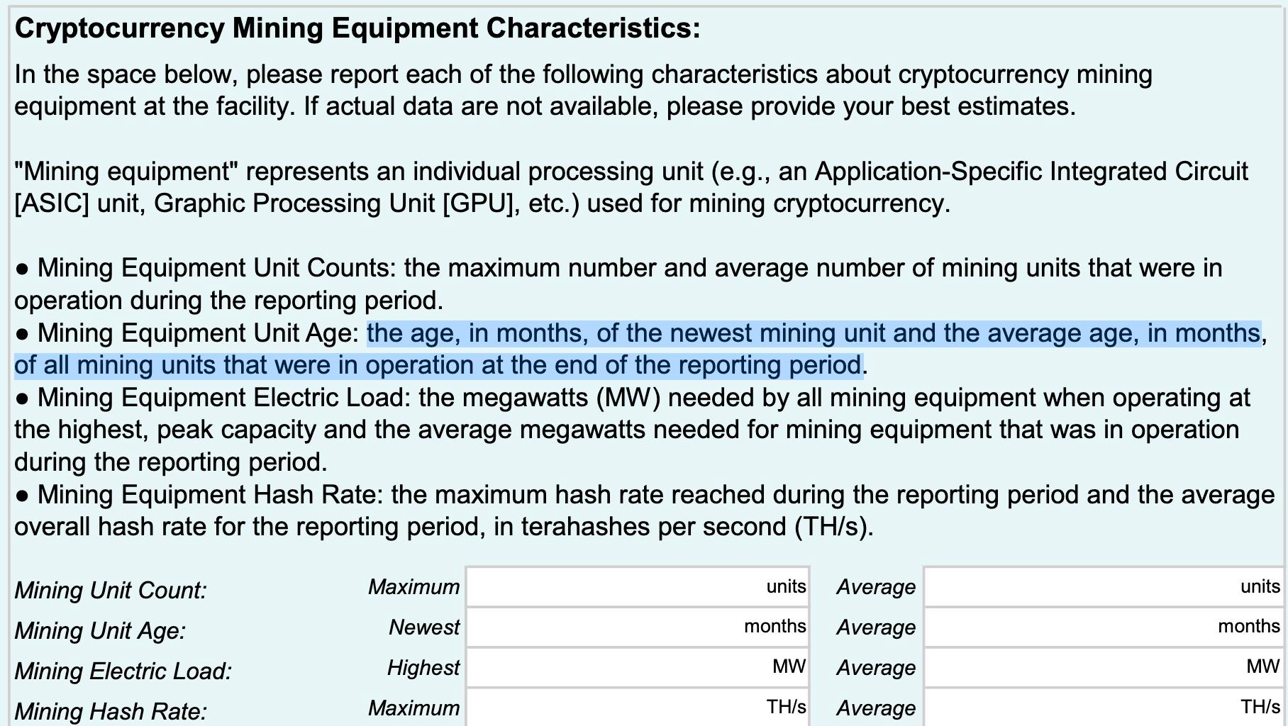 And last, but certainly not least, miners will be expected to give detailed information about their mining fleets. The EIA wants to know the number of ASICs miners are running at individual facilities, the models of the miners (which will be determined by cross referencing the age of the miner with different model releases), the amount of energy needed to power those mining machines, and the maximum amount of hashrate they produced during the reporting period.