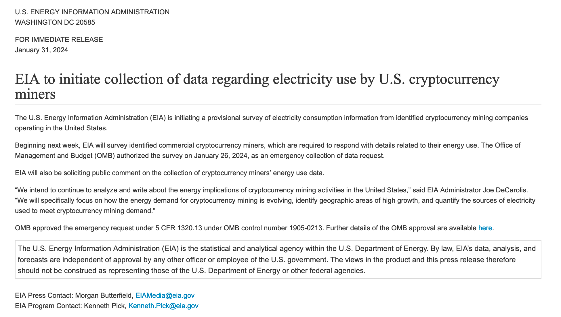 Earlier today, the Biden Administration announced an emergency data collection initiative targeted at bitcoin mining operations in the US via the US Energy Information Administration, an "independent" sub-agency of the Department of Energy.