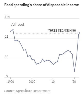Further exacerbating the strain, the Journal reported a rise in the percentage of income spent on food — from just over 9% pre-pandemic to the current 11.4%, a figure reminiscent of an era predating the internet, when "Terminator 2" was a box office hit and Madonna dominated the music scene. This increase is attributed to escalating costs of food production inputs and labor, with the latter influenced by recent minimum wage increases in 22 states.