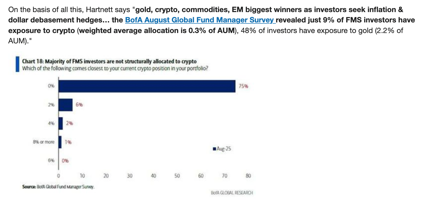 On the second point, I think it is important to not anchor to the allocations of their total portfolios that the managers surveyed by Bank of America have to gold, or the fact that it was only 48% of managers surveyed. Since bitcoin is still in its monetization phase, more risk-averse managers will likely have a lower overall allocation because it's easier to make up for a lack of exposure with outsized performance, which bitcoin can provide against gold at this point of its lifecycle. Conversely, there will be managers who like risk and want to clobber their peers with out performance, so they could allocate more than their peers would deem appropriate. Lastly, gold has been around for thousands of years and is analog bitcoin. I think it is important to recognize that bitcoin is a digital beast that comes with different and superior properties to gold that can create a lot more value on top of the network.