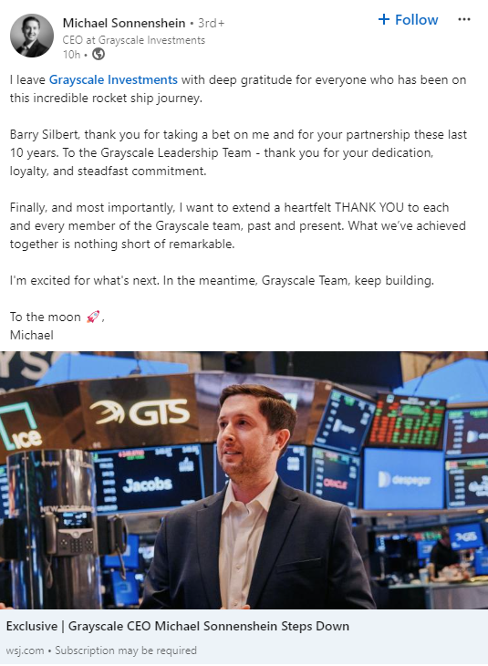 Michael Sonnenshein has resigned as CEO of Grayscale Investments, a role he held since 2021. Sonnenshein will be succeeded by Peter Mintzberg, a former Goldman Sachs executive, on August 15th.