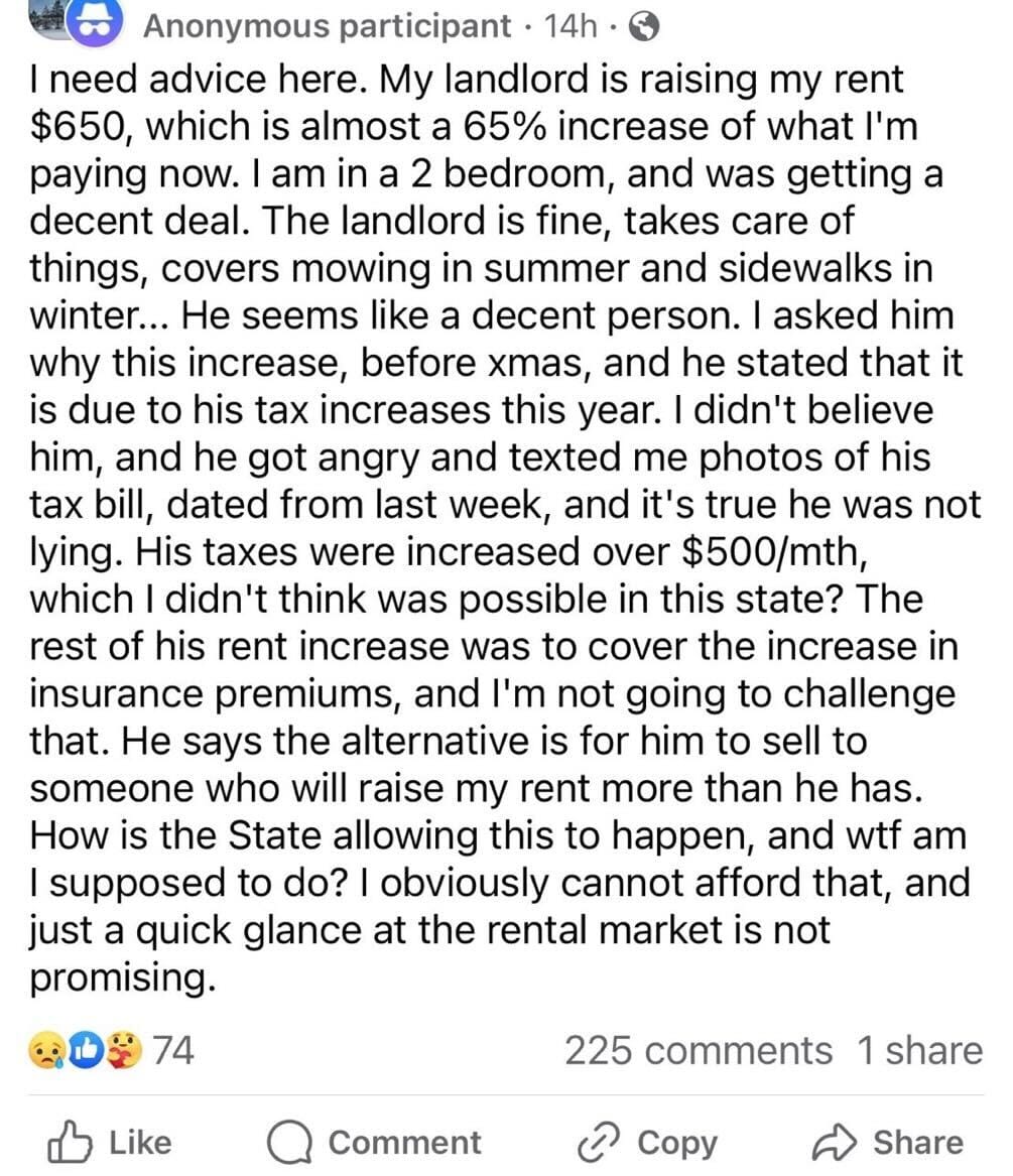 The cost of living is going through the roof. Just to get groceries is almost a second mortgage.