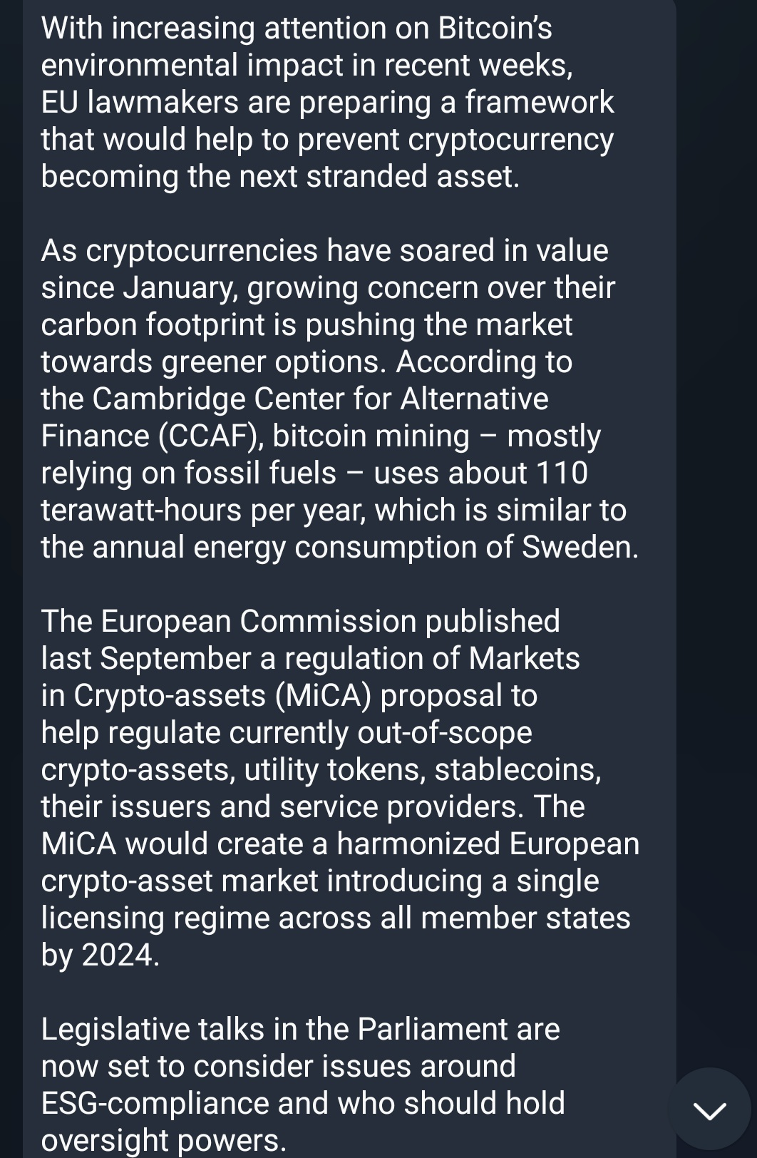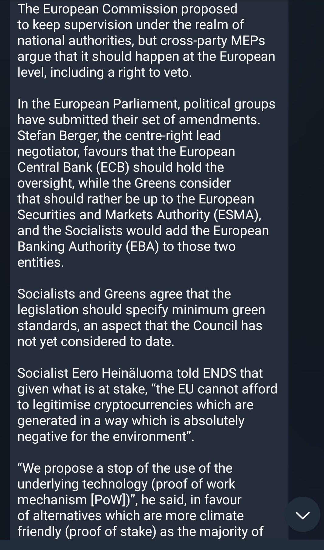 Apparently, the European Parliament is set to agree on a proposal for "cryptocurrency regulations" that would target Proof of Work, the consensus mechanism that makes Bitcoin operational. I must admit my grasp on the current political landscape of the European Union is a bit weak compared to the days when I had a professional duty to track Mario "whatever it takes" Draghi and the political landscape of the region, but I feel confident enough to put forth that the European Parliament may be bold enough and stupid enough to attempt to ban Proof of Work throughout the European Union in an effort to appease the growing ESG movement.