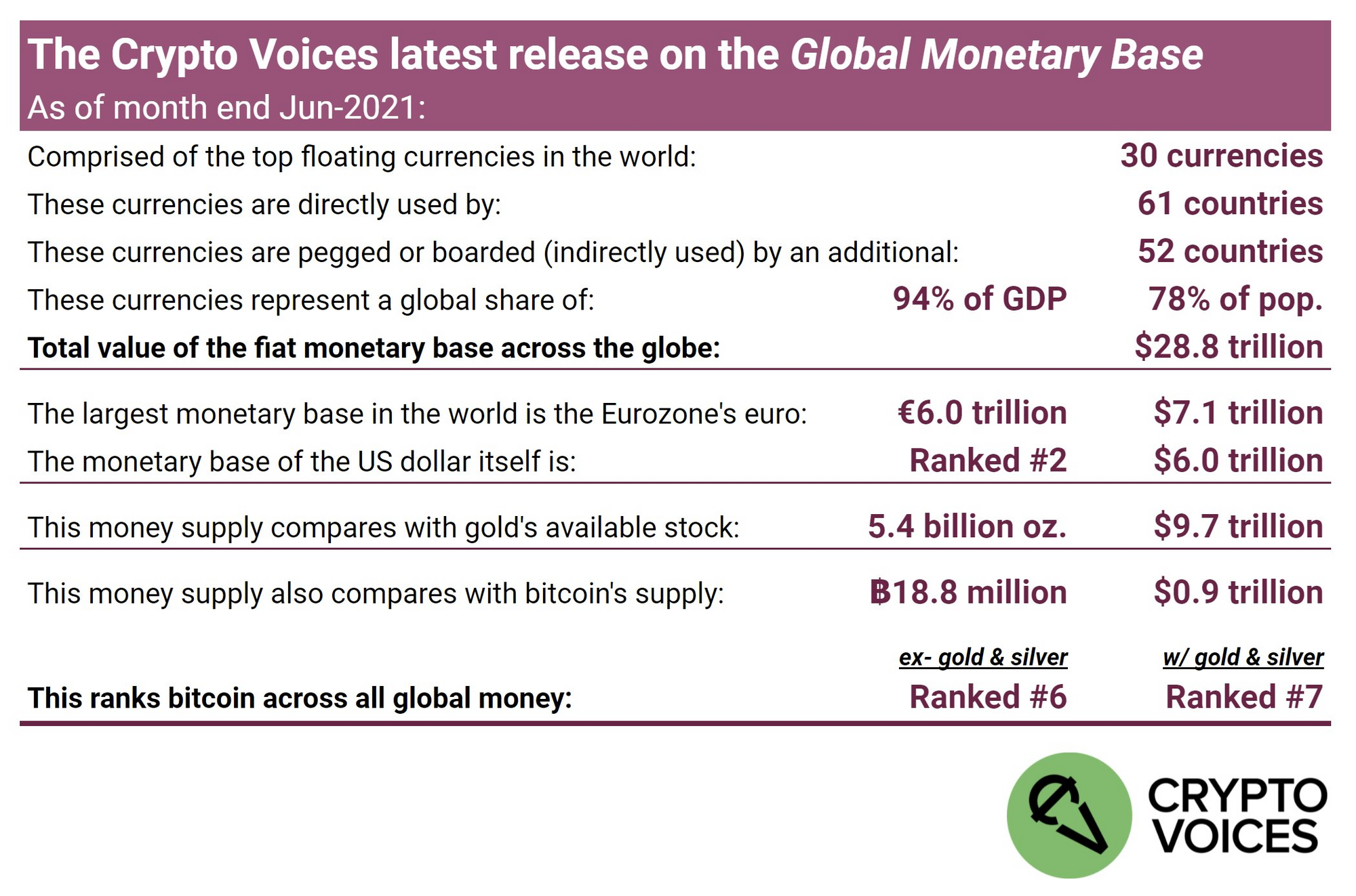 It's that time of the quarter again; Matthew Mežinskis from the Crypto Voices podcast (which focuses on bitcoin) has released the Q2 2021 monetary base update. As always, the thread is incredibly thorough and filled with incredible detail about the current state of global base monies. Right now, bitcoin is holding steady as the sixth largest base money on the planet (when gold and silver are taken out of consideration, seventh when they are considered), which is exactly where it stood at the end of Q1 this year.
