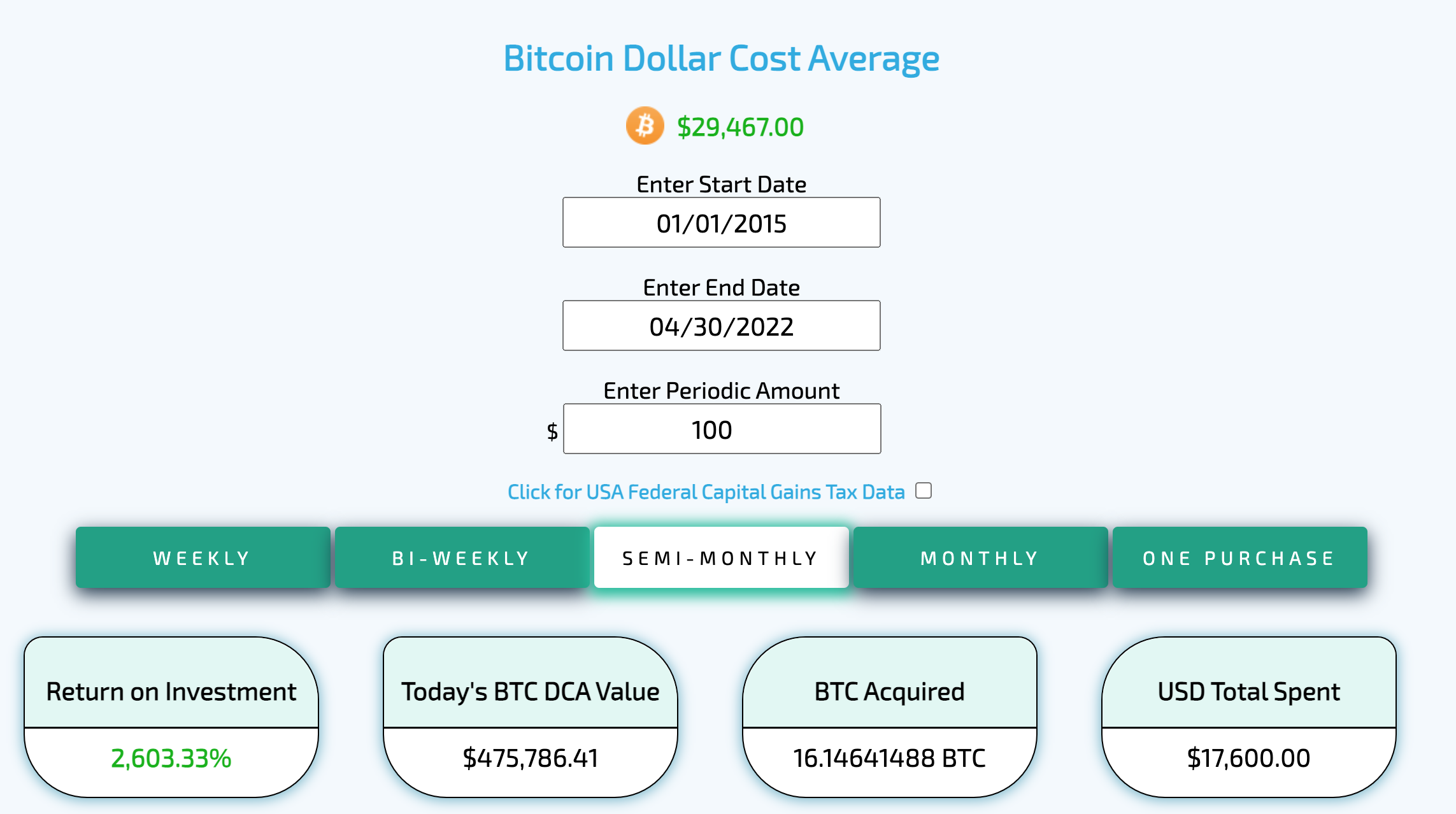 As you can see by zooming out, the price of eggs as measured in sats fell by *checks notes* 99.3% since January 2015 (when the Fed started tracking bitcoin data) while rising by 19.2%. Sure there was some volatility along the way, but over the course of 76 months an individual's purchasing power increased significantly if they were holding bitcoin. To visualize this increase in purchasing power another way, here's what it would look like if an individual were to take $100 per paycheck since the beginning of 2015 to save in bitcoin.