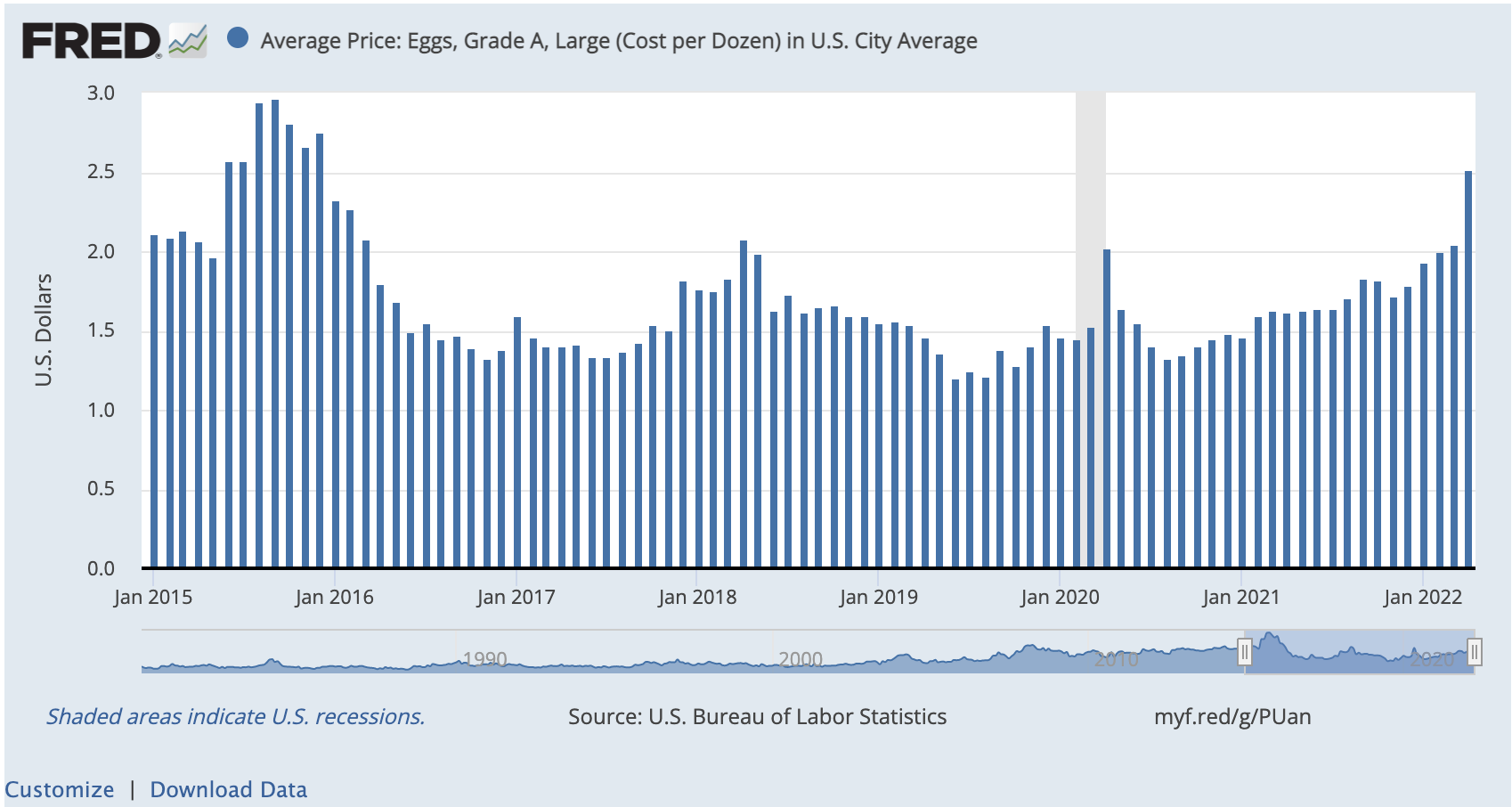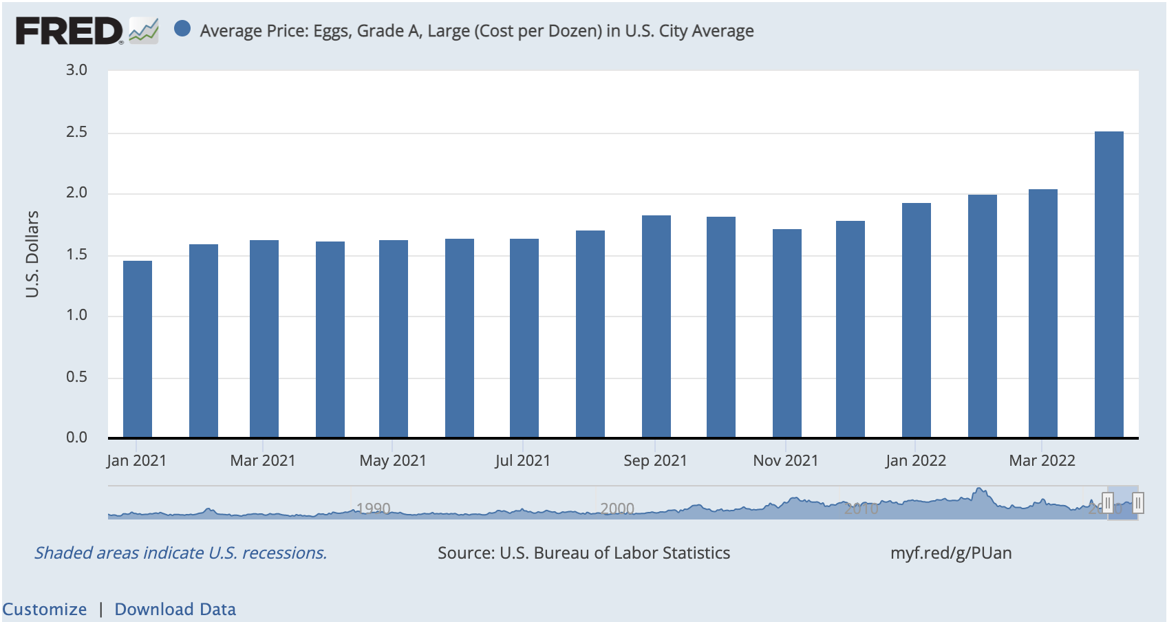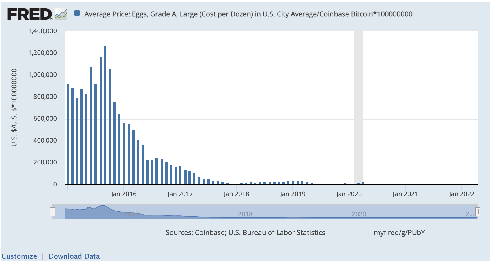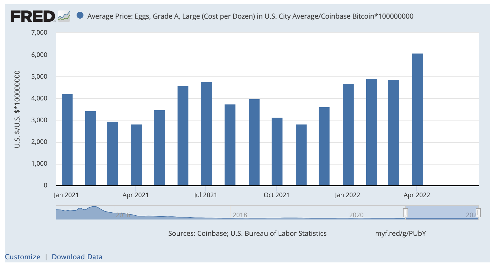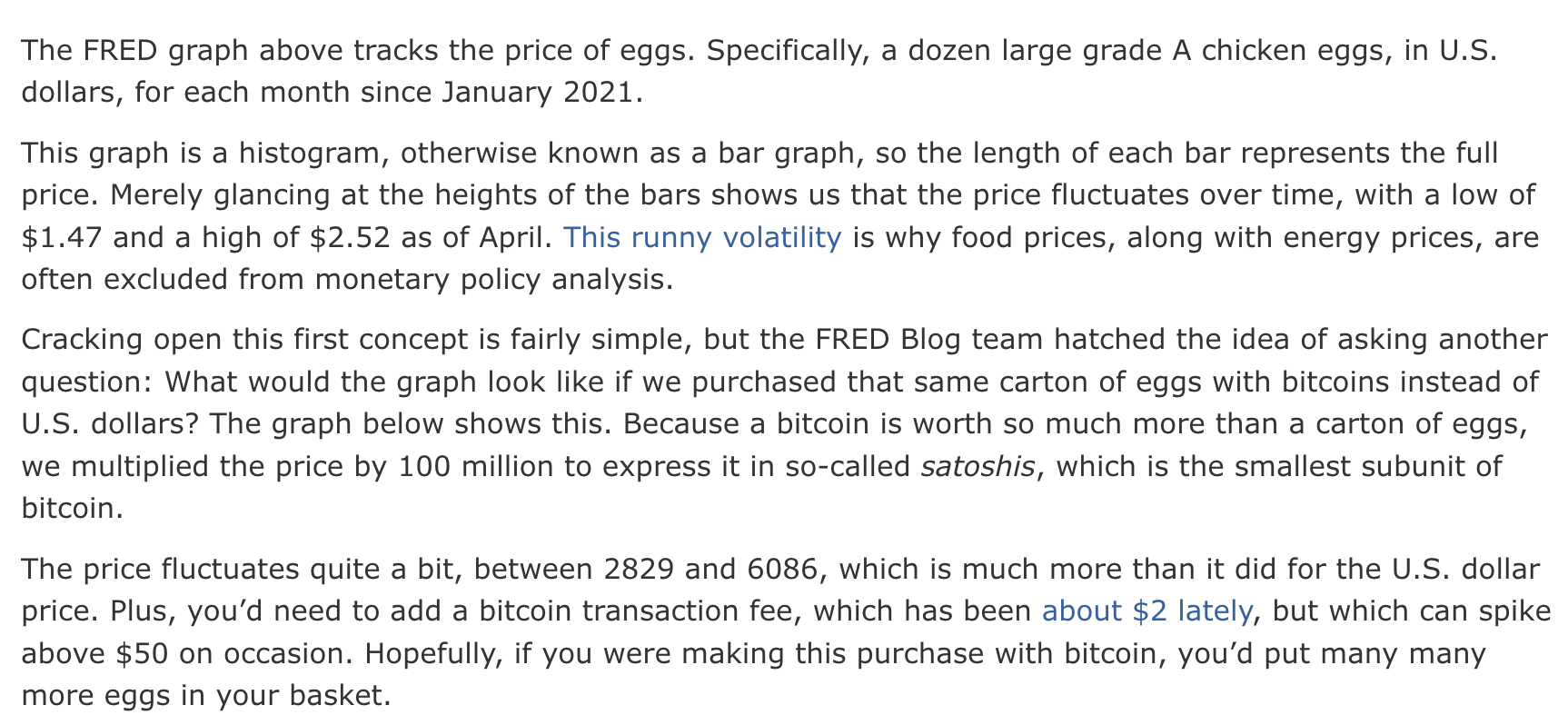The comedians over at the St. Louis Fed dropped a blogpost earlier today that compared the fluctuation of eggs prices in US dollars and sats from the beginning of 2021 through April of this year. It seems like an attempt to dunk on bitcoin, but if you look closely at the charts you'll see that the overall inflation rate of eggs over the cherrypicked timeframe is lower in sats (44.3%) than it is in dollars (71.9%). Sure, bitcoin's price did fluctuate more rapidly over the timeframe, but if the Fed is going to cherrypick data, we here at TFTC are going to do so as well to prove why this isn't the most accurate representation of the situation.