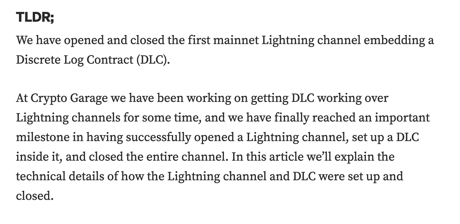 Well, the team from Crypto Garage announced yesterday that they successfully opened and closed a Lightning channel with an embedded DLC channel on mainnet. Per their blogpost it looks like the Crypto Garage team forked the Lightning Development Kit to add support for splitting a Lightning channel, which has enabled them to create a DLC channel within a Lightning channel. From there they were able to create special transactions (a split transaction and a glue transaction) that would enable the different parties engaged in a DLC to update the state of their contract within the Lightning channel and the DLC channel without giving one of the parties an unfair advantage, which was one of the big design challenges that was previously unsolved. This is a massive step in the right direction.