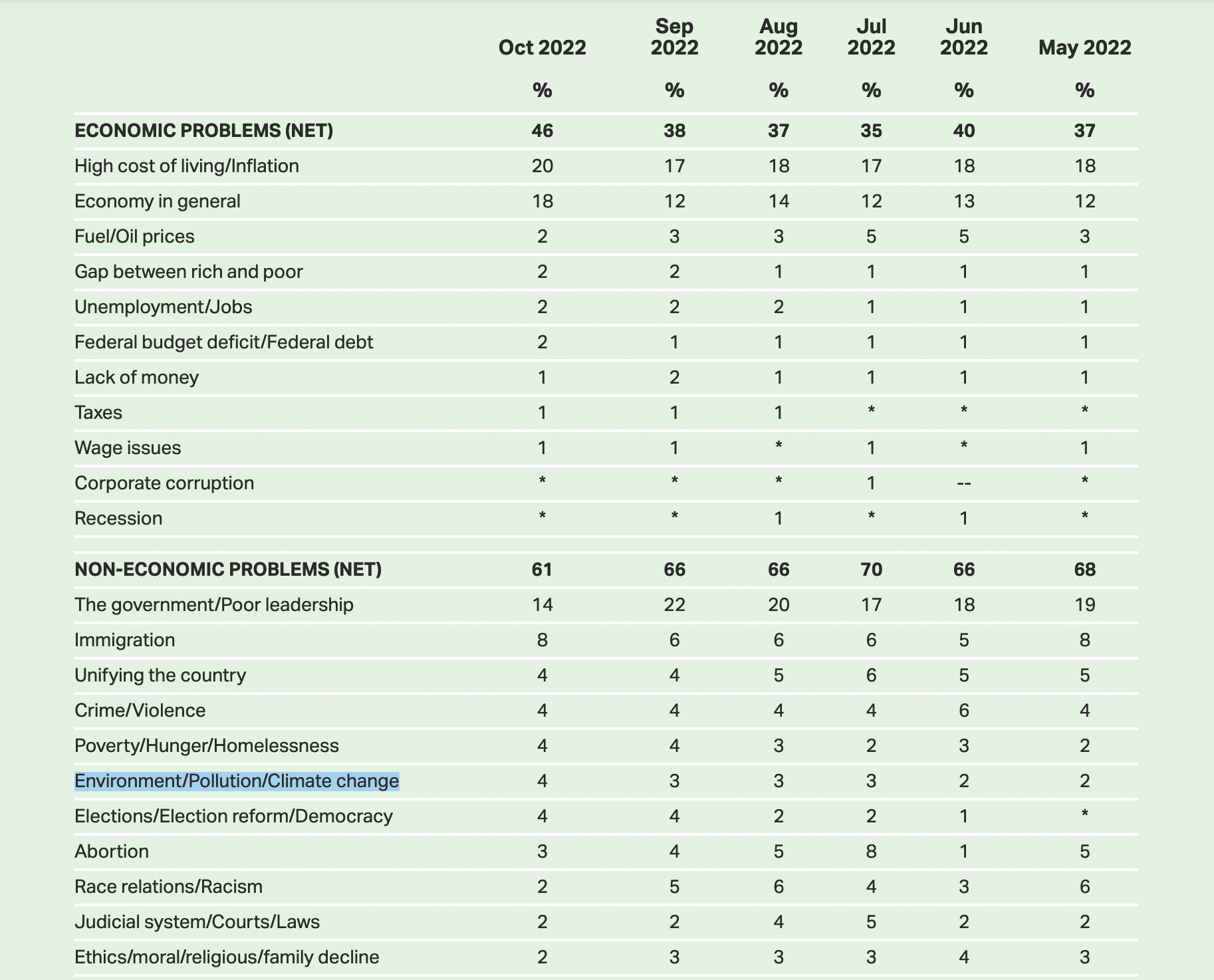 What Rishi is really saying is that 80% of the unproductive class represented by world "leaders" like himself and their unelected friends at the World Economic Forum, central banks, big commercial banks, and asset managers of the world have decided to try to force their "net-zero" agenda on the rest of the world. Using fear tactics and pure propaganda in an attempt to convince the world that it is the right thing to do. But when it comes to the things the individuals who make up the economy actually care about, rearchitecting how everyone lives their lives in an attempt to avoid "cataclysmic climate change" is nowhere close to being a serious issue. In fact, only 4% of Americans think it is "the most important issue facing the country today".